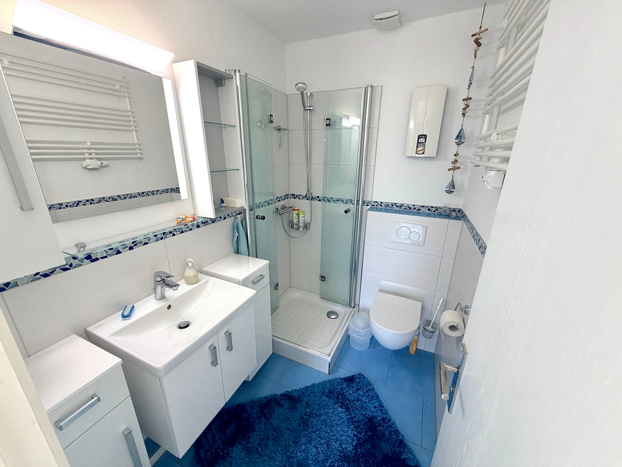 - modernisiertes Duschbad mit weißen Badmöbeln und Sanitärobjekten, Echtglas-Dusche und Wandheizkörper